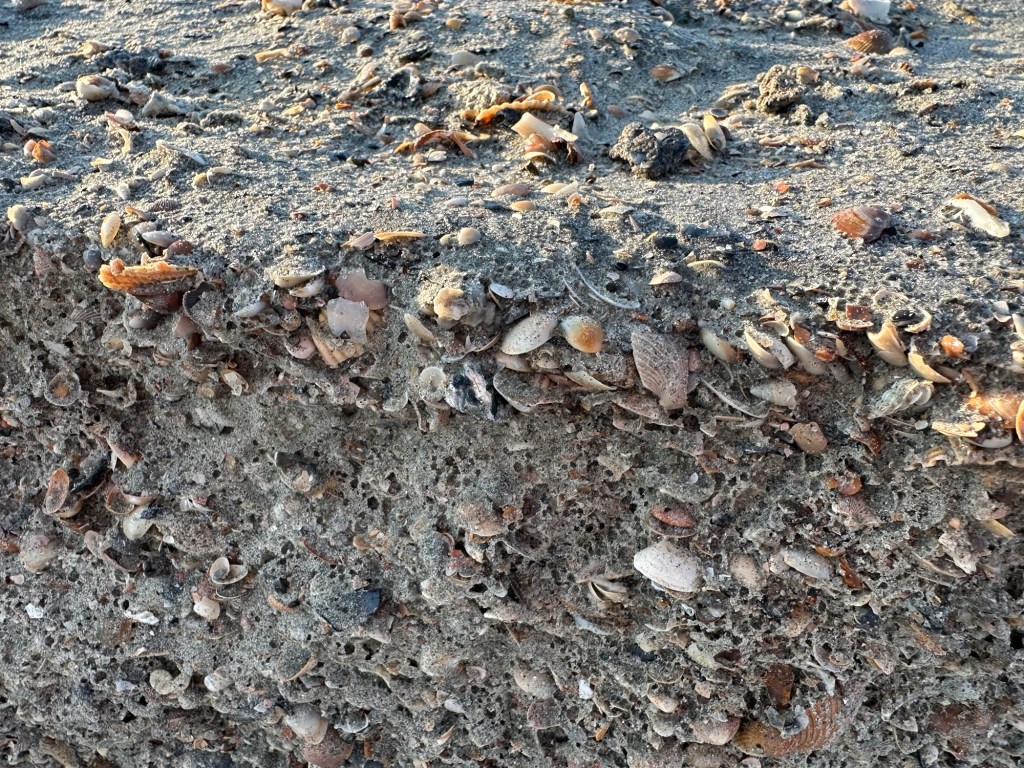 The tide was in when we arrived down there, and once settled in, we discovered a sand bank where the high tide meets the official shore. There, we discovered a layer of a thick shell deposit embedded into that shelf. We spent an hour or so combing through the battered shells, and Melissa, with her luck, discovered a few solid ones to take back as souvenirs.